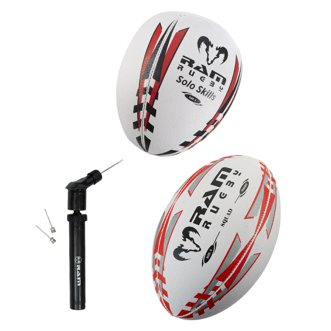 El Juego de Regalo de Rugby RAM es un paquete práctico y bien equilibrado para jugadores de rugby de todos los niveles. El set incluye una pelota de entrenamiento Squad, una pelota de habilidad Solo y una bomba mini compacta, asegurando que ambas pelotas estén siempre listas para usar.